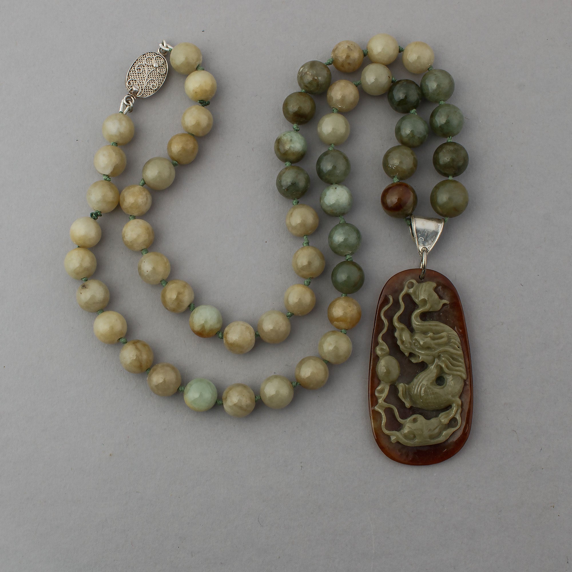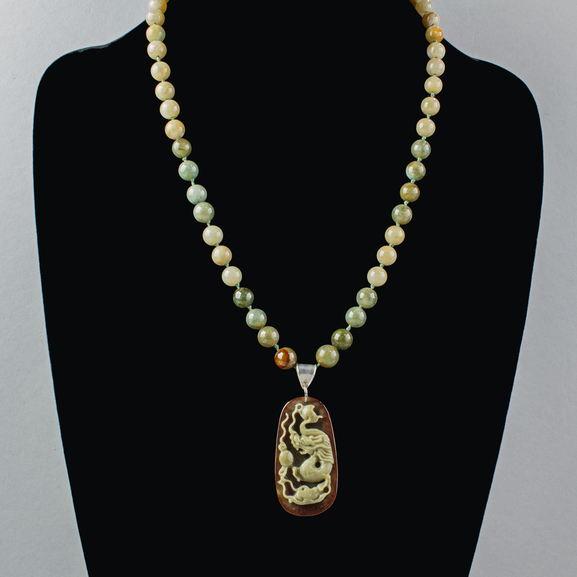 This estate jadeite bead necklace features a stunning pendant made from natural red and green jadeite. The pendant was carved from a block of jade in which the artist was able to carve the dragon in relief from the background that was the outer edge or “rind”. The dragon was carved from the green area of the jade with the reddish brown rind as a background. The necklace is composed of 9 mm jade beads in natural colors, ranging from pale to darker green with subtle red accents, each individually knotted on silk thread. The clasp and bail are made of sterling silver. The necklace measures 22 inches in length, while the pendant is 2 inches by 1.1 inches and 0.2 inches thick.