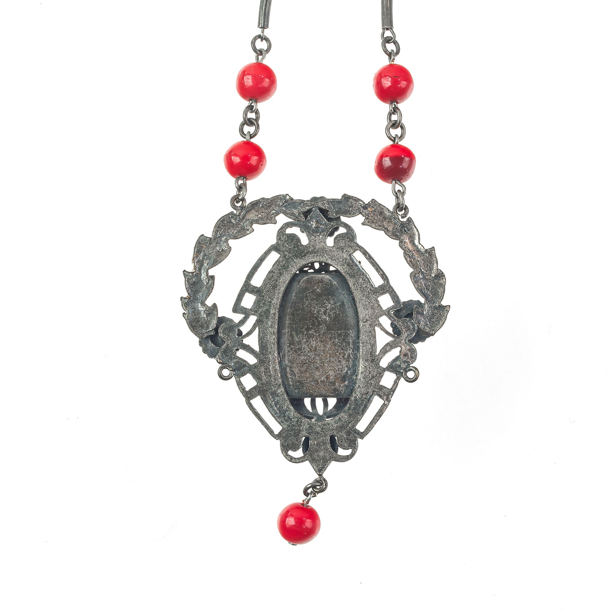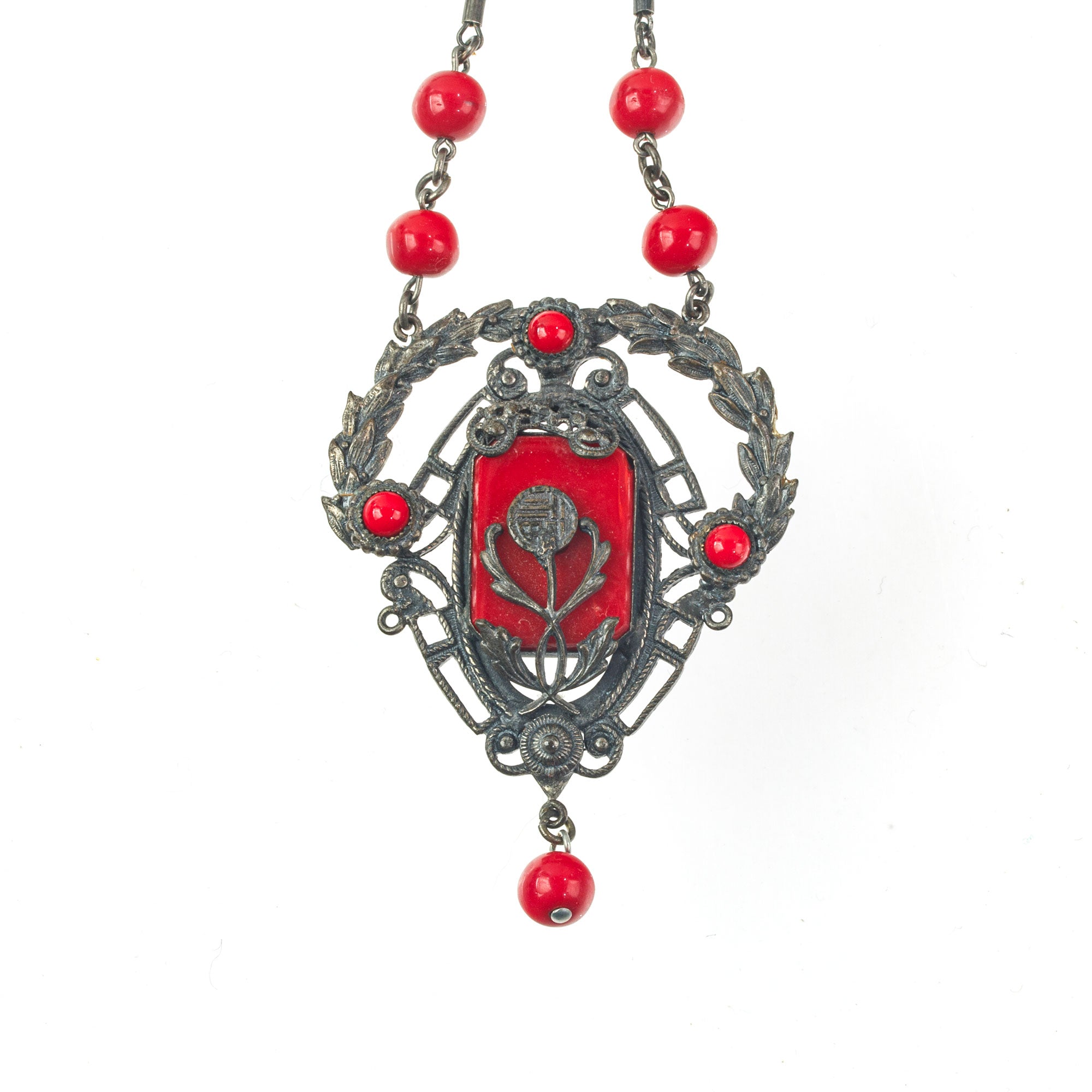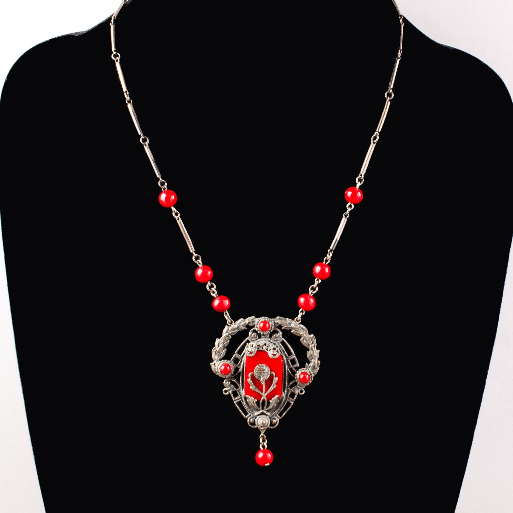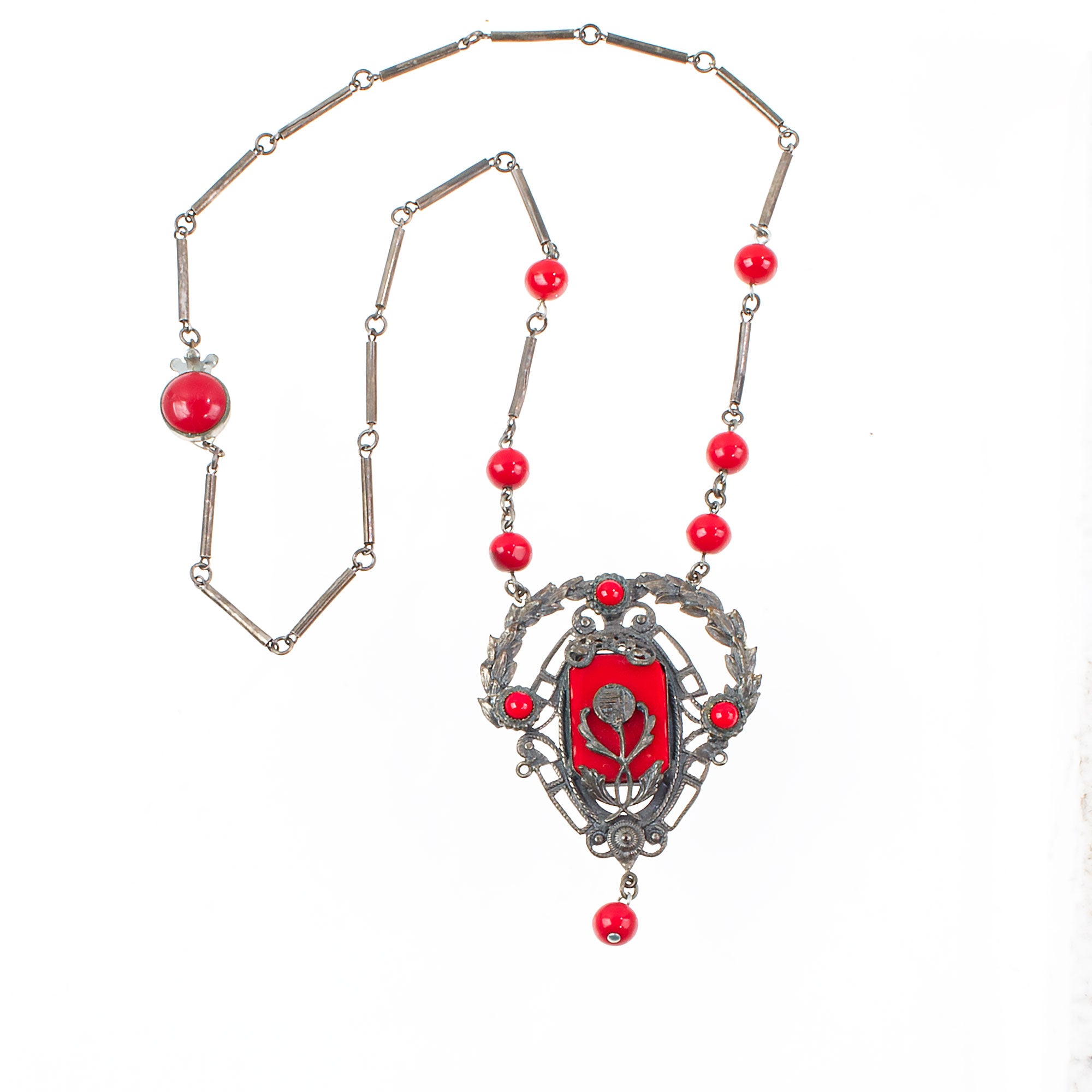A superb Art Nouveau necklace from the 1920s. A silver metal pendant with red glass stones in classic Bohemian style metalwork setting. Matching red glass bead dangles from the base. The pendant hangs from a chain of matching red beads and silver plated links. Matching bezel set red glass box clasp. . Necklace circumference is 20.5". Pendant with dangle is 2 5/8" x 2". Excellent condition.