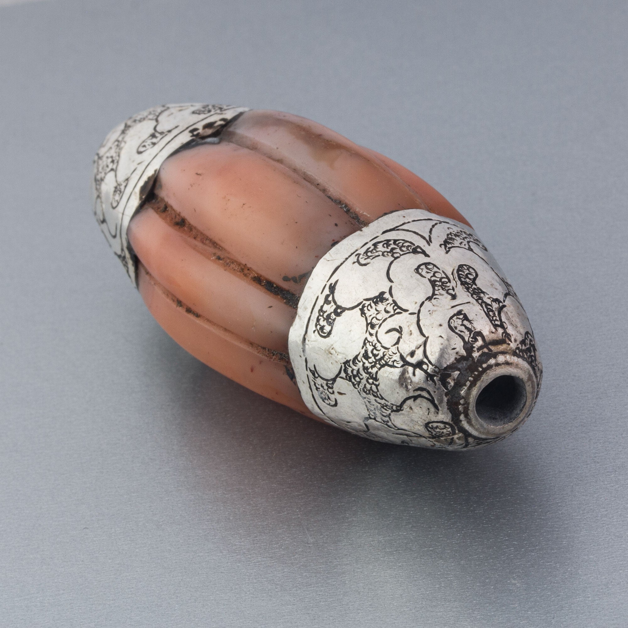 Vintage Nepal large carved carnelian agate melon bead with repoussé sterling silver caps. 61.5mm x 28mm. This vintage or antique bead is set more recently in sterling silver caps by artisans in Nepal. This is a rare old bead that shows a bit of wear which greatly adds to its character. It makes a wonderful focal bead. Sold individually.