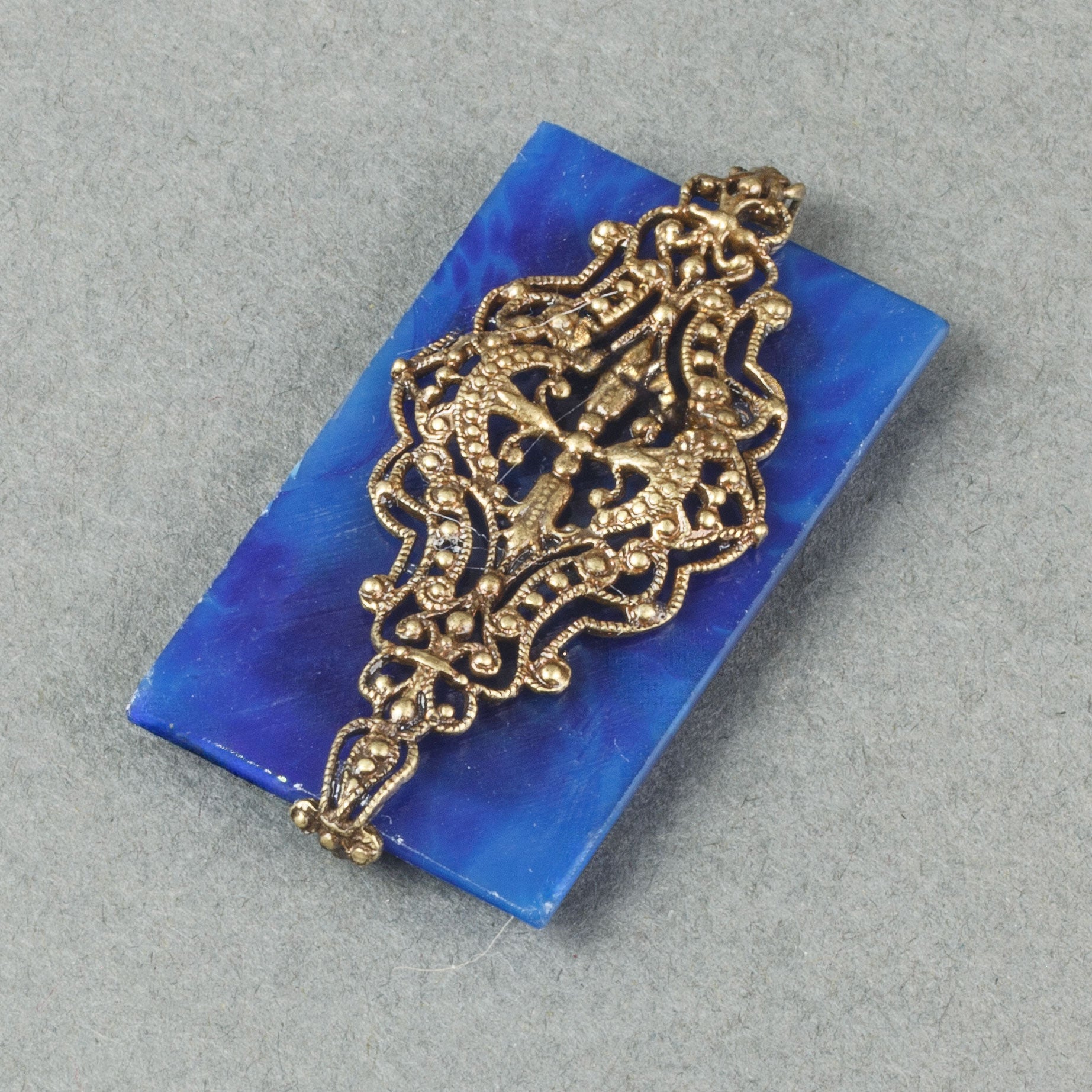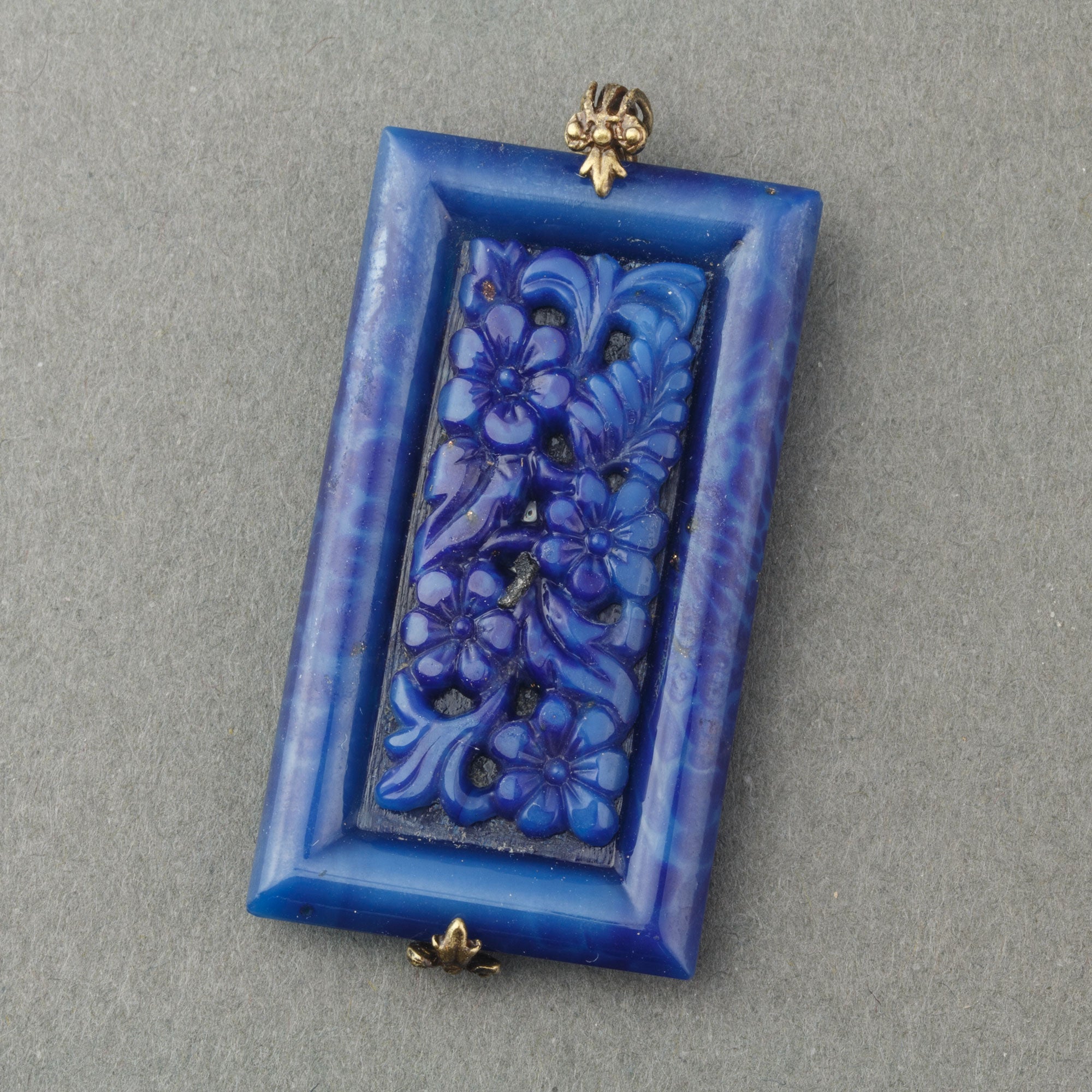 This pendant is made from a framed blue lapis glass panel cabochon from Gablonz, Bohemia in the 1920s. The interior of the frame features a molded and pierced (appearing carved) floral pattern. A stamped brass filigree component wraps around the stone with a loop at the top for a chain or ribbon. Pendant measures 45x25mm.