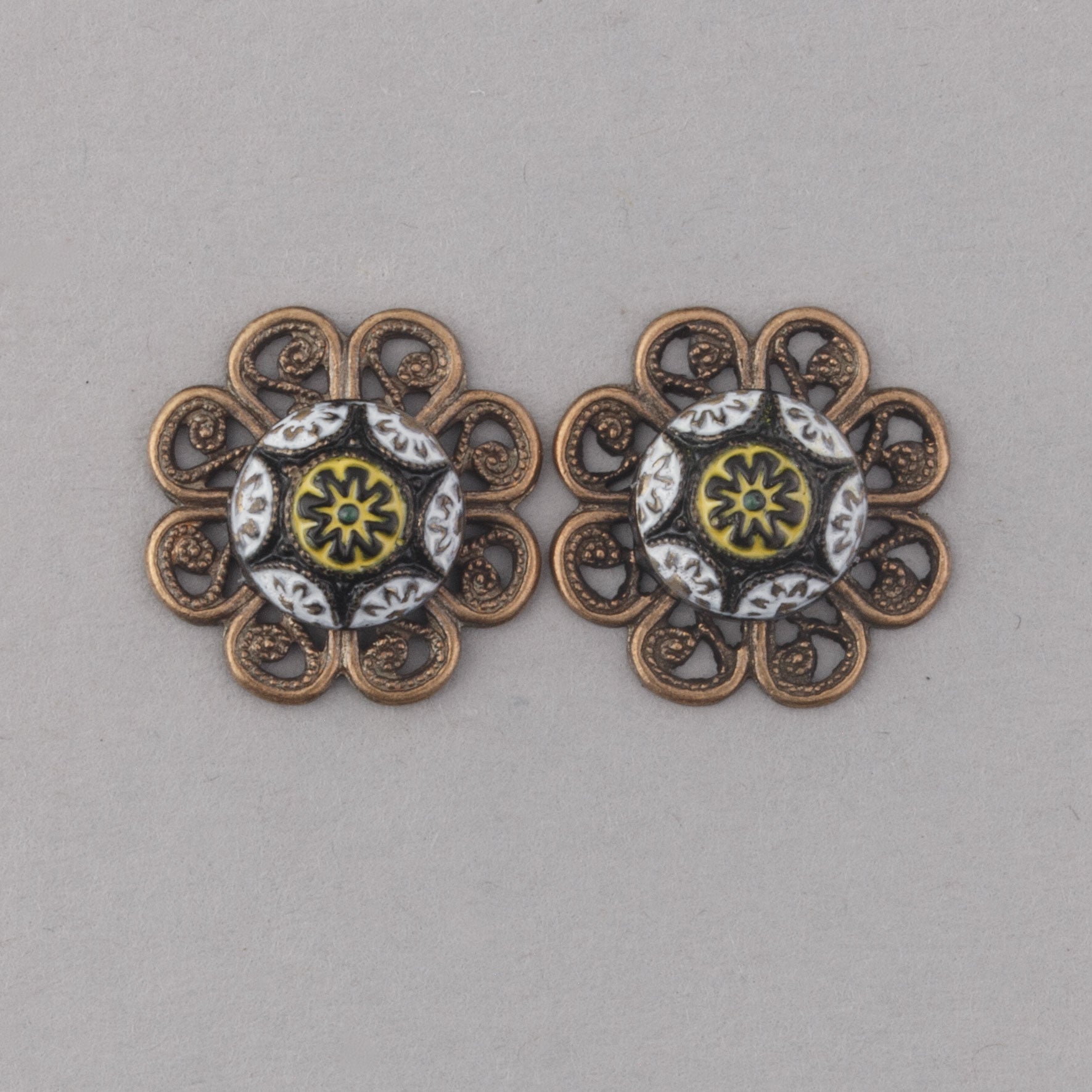 Flower charms of pressed molded glass "mosaic" stones charms with white, black and yellow accents. Solid brass backing with filigree border. Vintage West Germany. 15mm. Pkg of 4