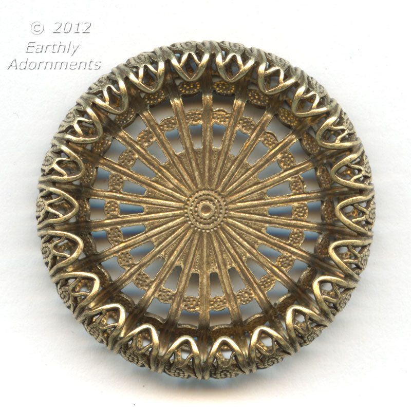 Oxidized brass filigree setting for a flat back round cabochon 12mm in diameter. Setting diameter is 32". Sold individually.