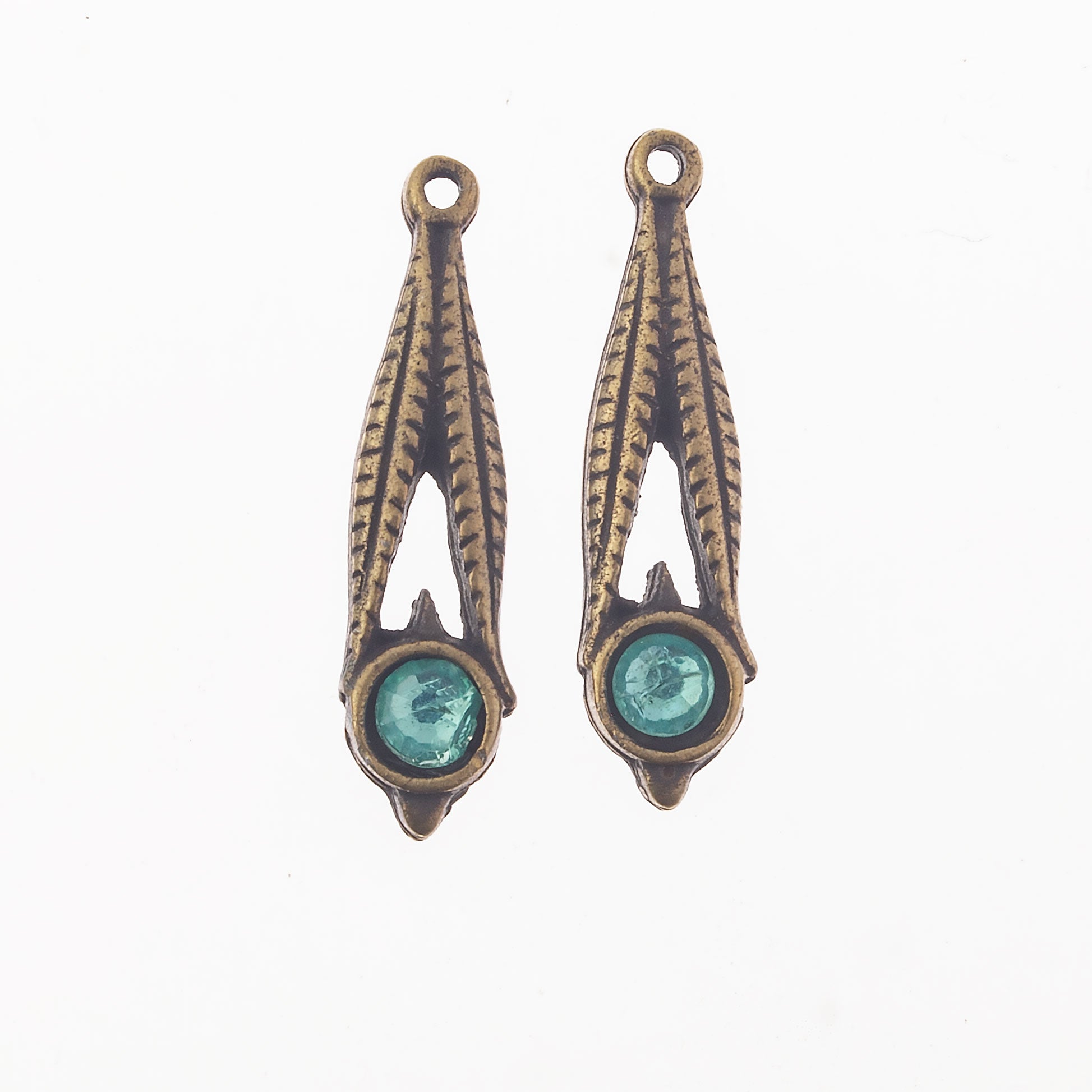 Vintage cast brass pendant with aquamarine glass stone. 24x6mm. Package of 2