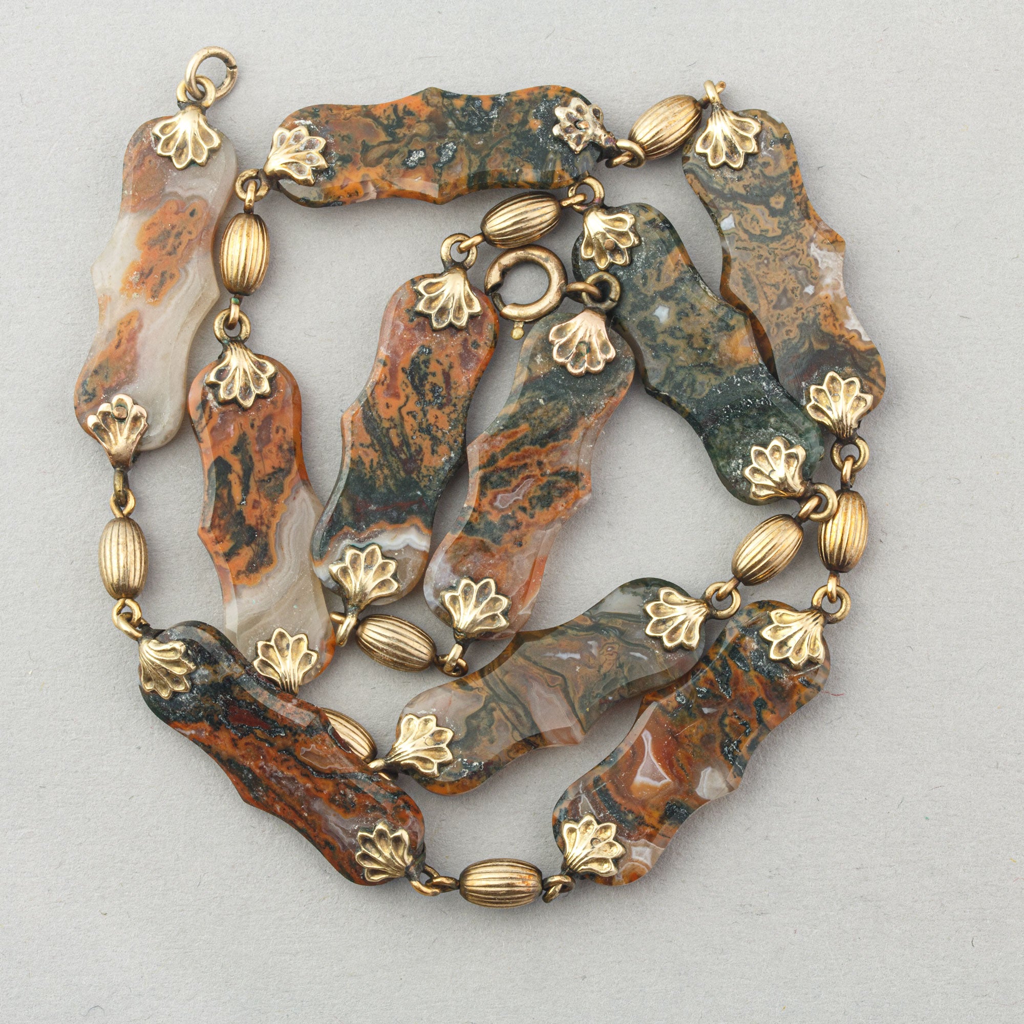 One-of-a-kind Victorian 14k carved Moss Agate necklace. It features ten semi-transparent, multi-colored carved flat lozenges, each measuring 28mm x 10mm and 2.6mm thick. The ends are adorned with gold petal-shaped bails and connected by alternating gold oval fluted beads. The necklace has a length of 17 inches and features a spring clasp. While the gold is unmarked, it has been tested for 14k yellow gold. The total weight is 29.7 grams. This necklace was acquired from a collector's estate.
