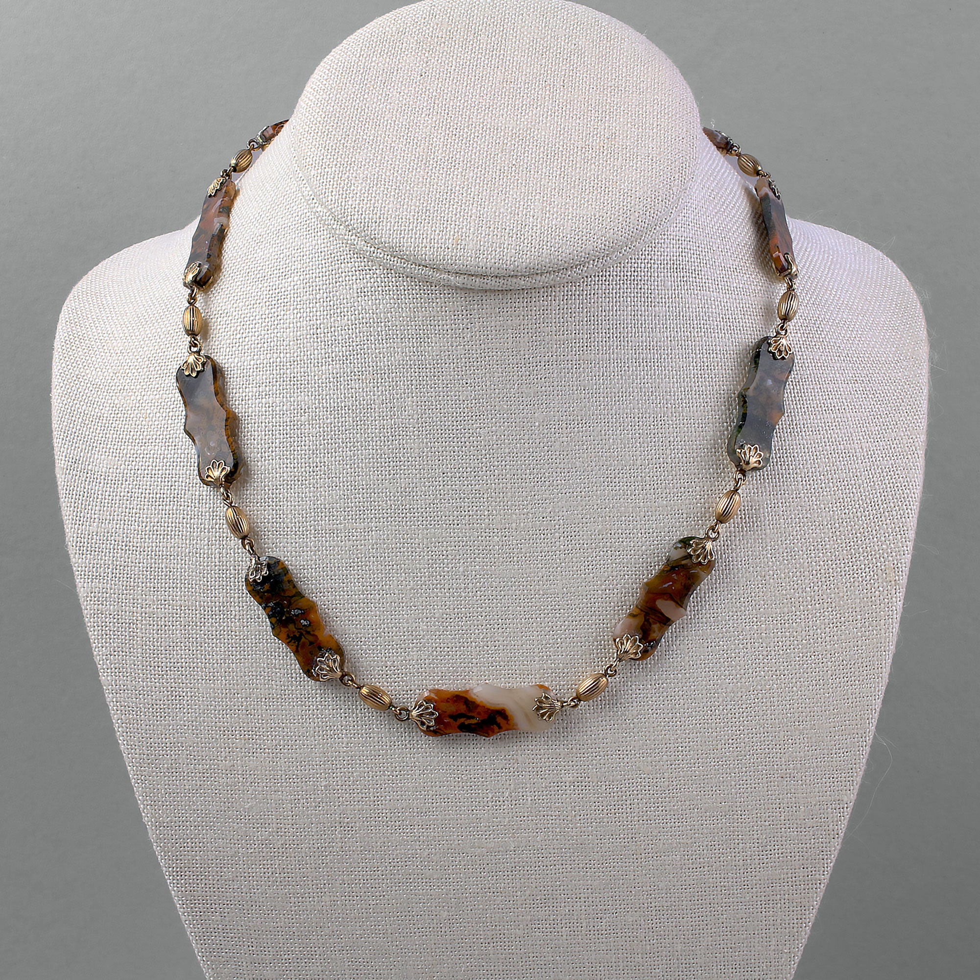 Victorian 14k carved Moss Agate necklace. 17". j-nlvc528sbk