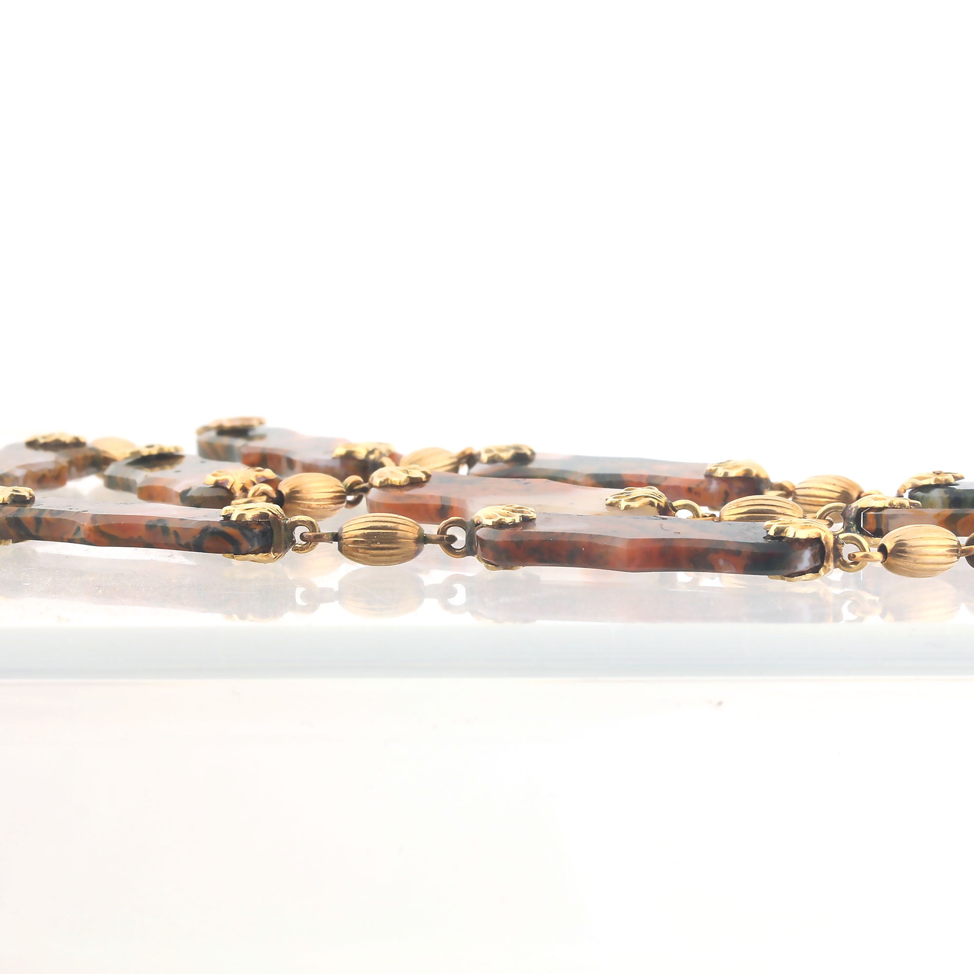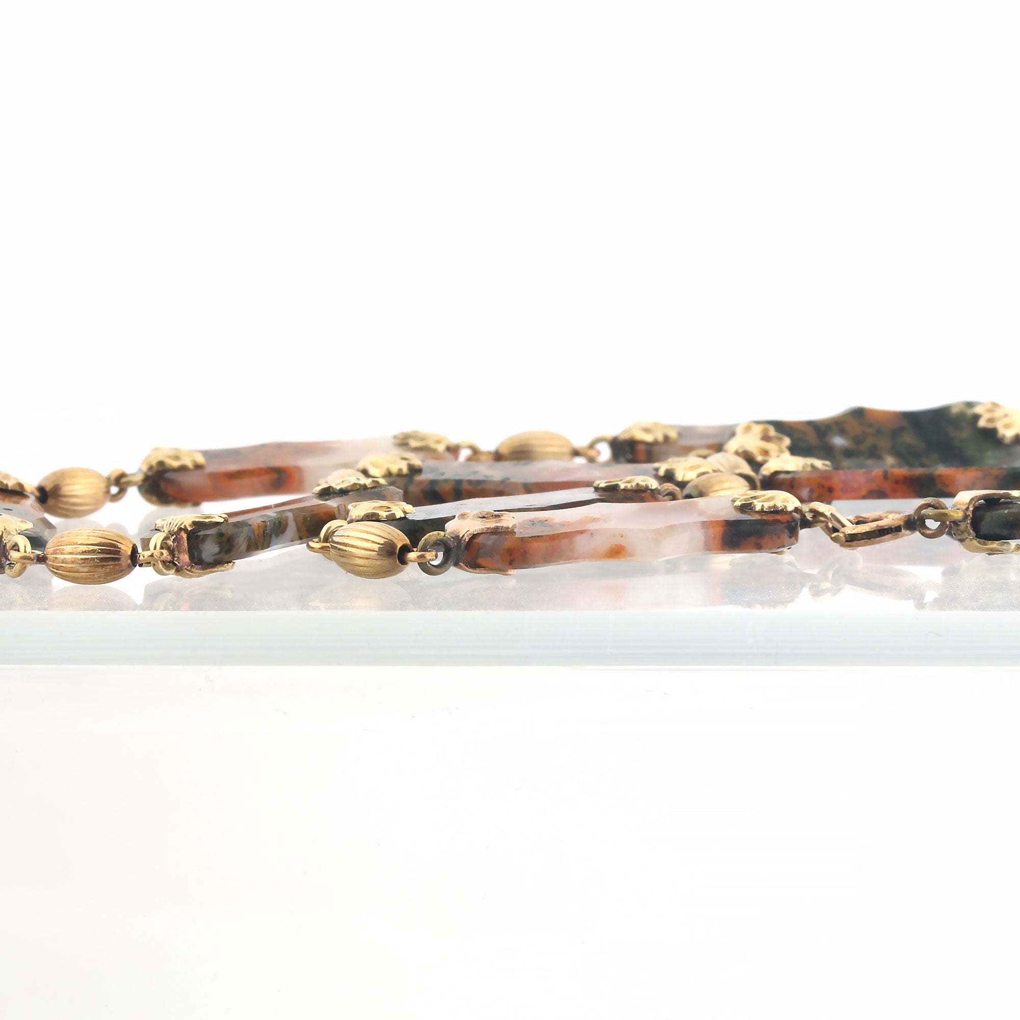 One-of-a-kind Victorian 14k carved Moss Agate necklace. It features ten semi-transparent, multi-colored carved flat lozenges, each measuring 28mm x 10mm and 2.6mm thick. The ends are adorned with gold petal-shaped bails and connected by alternating gold oval fluted beads. The necklace has a length of 17 inches and features a spring clasp. While the gold is unmarked, it has been tested for 14k yellow gold. The total weight is 29.7 grams.  This necklace was acquired from a collector's estate.