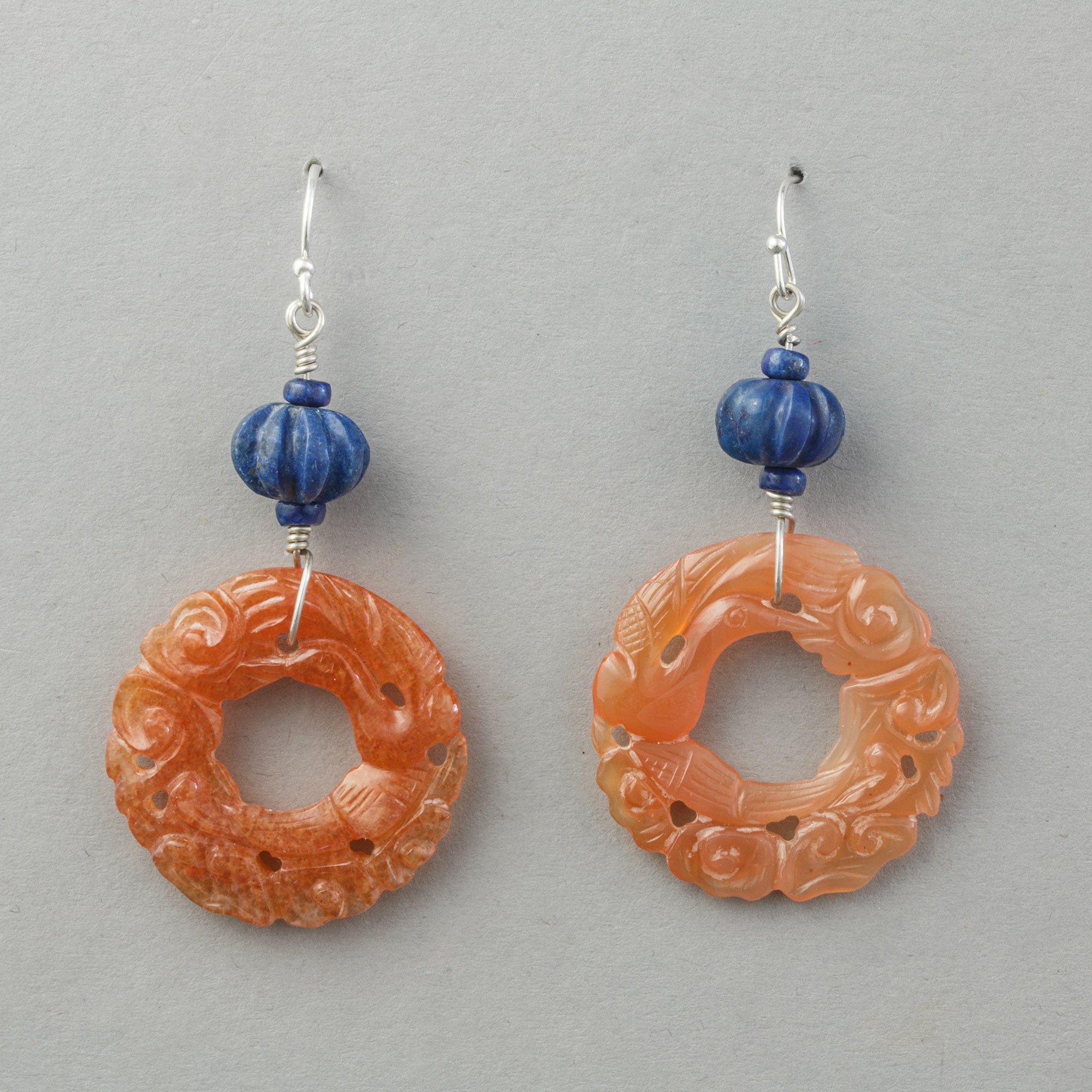 These drop earrings are made from carved Carnelian and Lapis. The hand carved Carnelian rings feature a design of a bird resting on a vine, with similar carvings on both sides. They dangle from carved Lapis melon beads and sterling silver ear wires. The total length of the earrings is 2.5 inches from the top of the ear wire to the bottom of the carved ring, and the carnelian rings measure 1.2 inches in width. Each earring is approximately 6 grams in weight.