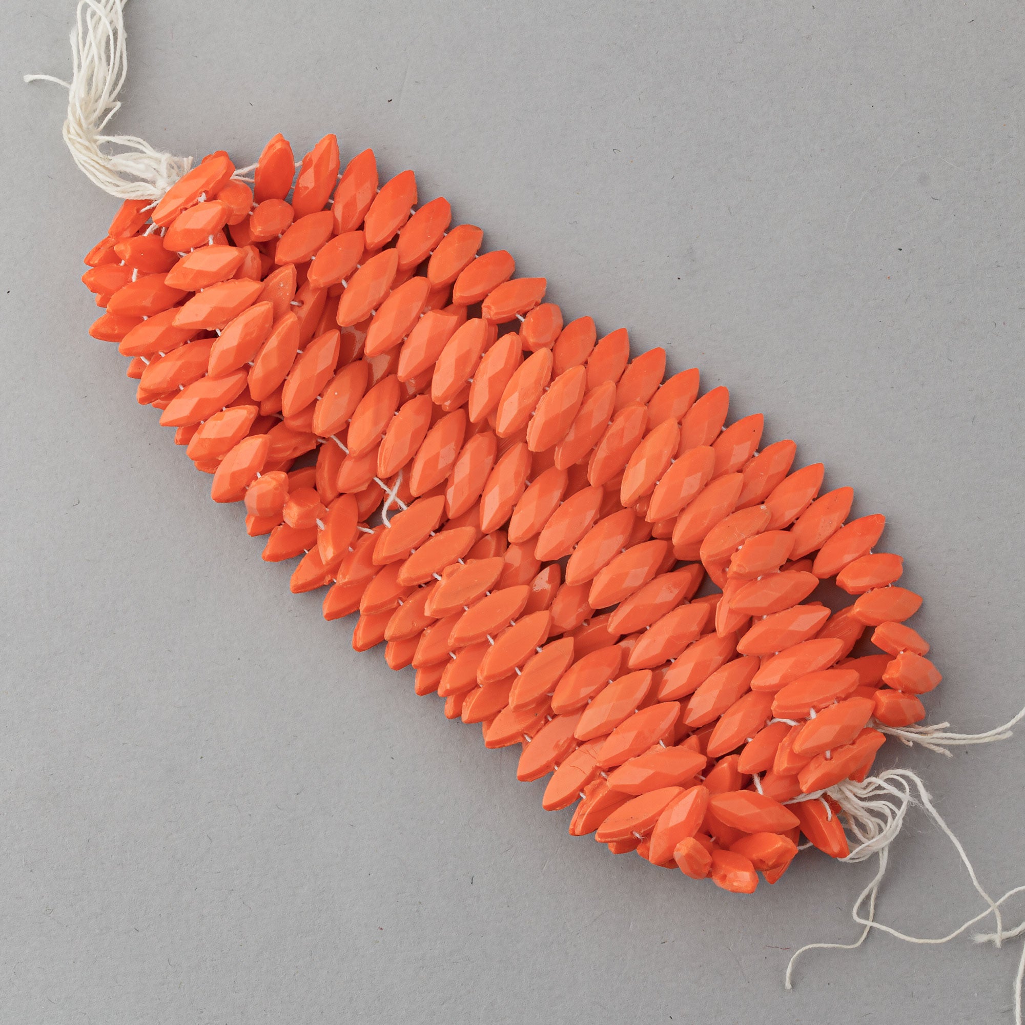 Antique Bohemian glass marquise shape flatback and domed other side. 5x12mm. Bohemia. Early 1900s. Hank of 12 strands of 24. 1.55 oz. The cotton threads on the strands are deteriorating so you will get a combination of strands and loose beads that total 1.55 oz..
