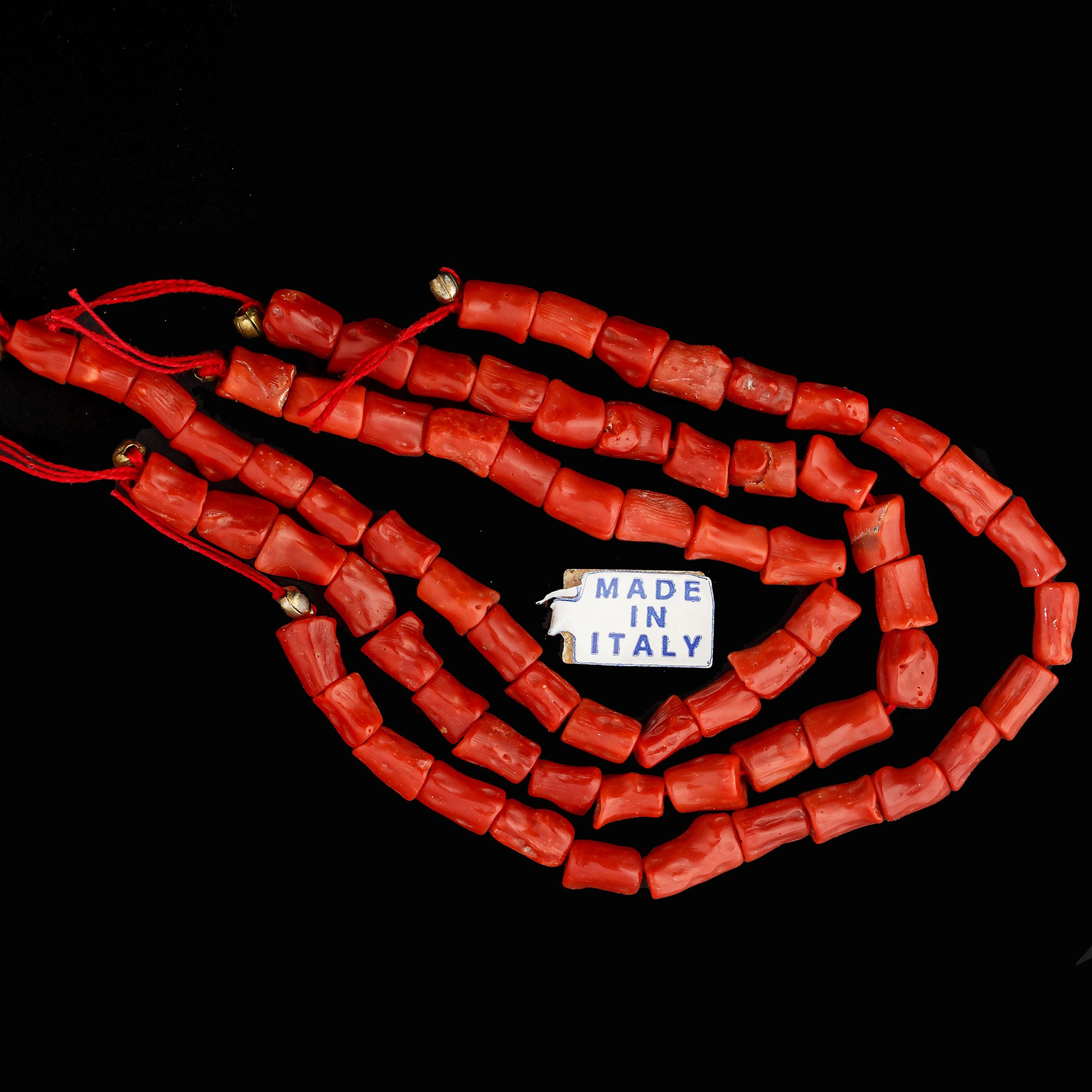 Genuine Mediterranean precious coral tube beads. This strand measures 7 inches and includes beads that are 7-8mm long and 5-6mm thick, with an average weight of 10.7 grams.