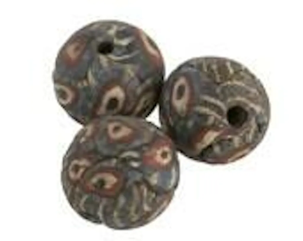 Jatim Eye Bead, blue and white striped background with red, white and blue "eyes". Jatim beads were produced in eastern and central Java, Indonesia from 900AD and earlier. These contemporary Indonesian eye beads are excellent replicas of the ancient bead. Each one is handmade, finely done and unique. Average size 16.5 mm. Sold individually