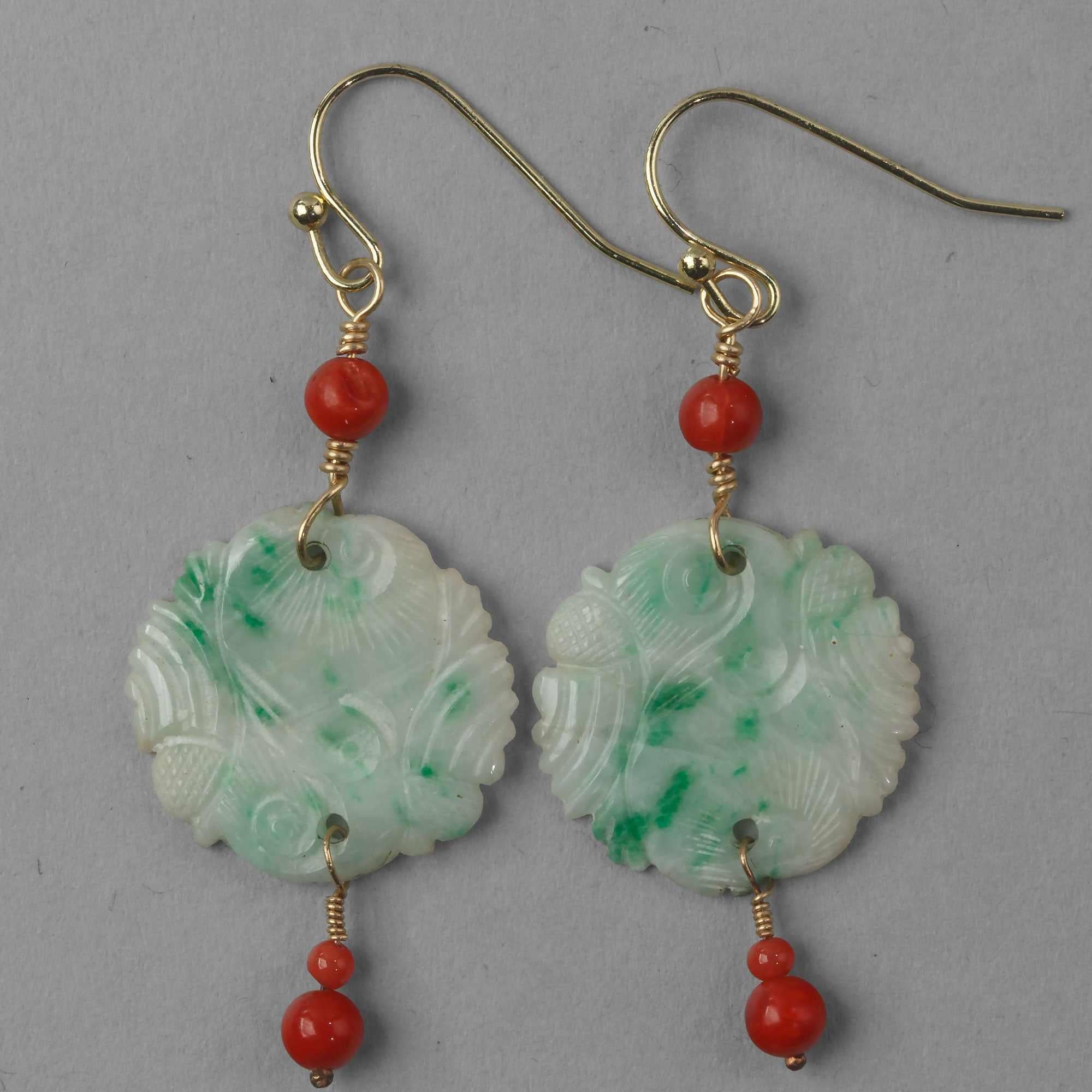 These earrings feature two beautiful old and unique Chinese carved and pierced green jade ornaments c.1900 that were once used as sew-on ornaments to hats and clothing. Attached to the disks are red precious natural Mediterranean coral beads. Sterling silver ear wires. . 2" in length from top of ear wire to bottom of pearl. Ornamental disks are 3/4" in diameter. Newly assembled from antique and vintage components.