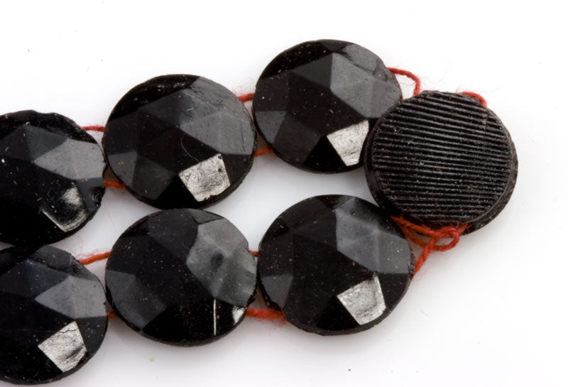 Antique Czechoslovakia domed and faceted black glass flat back beads-11mm diameter. Two holes. Flat on bottom, slightly domed and faceted on top side. Was originally a sew-on or sequin bead. Great for choker necklaces or bracelets.  Made in Gablonz, Bohemia in the 1920s.  Strand of 23