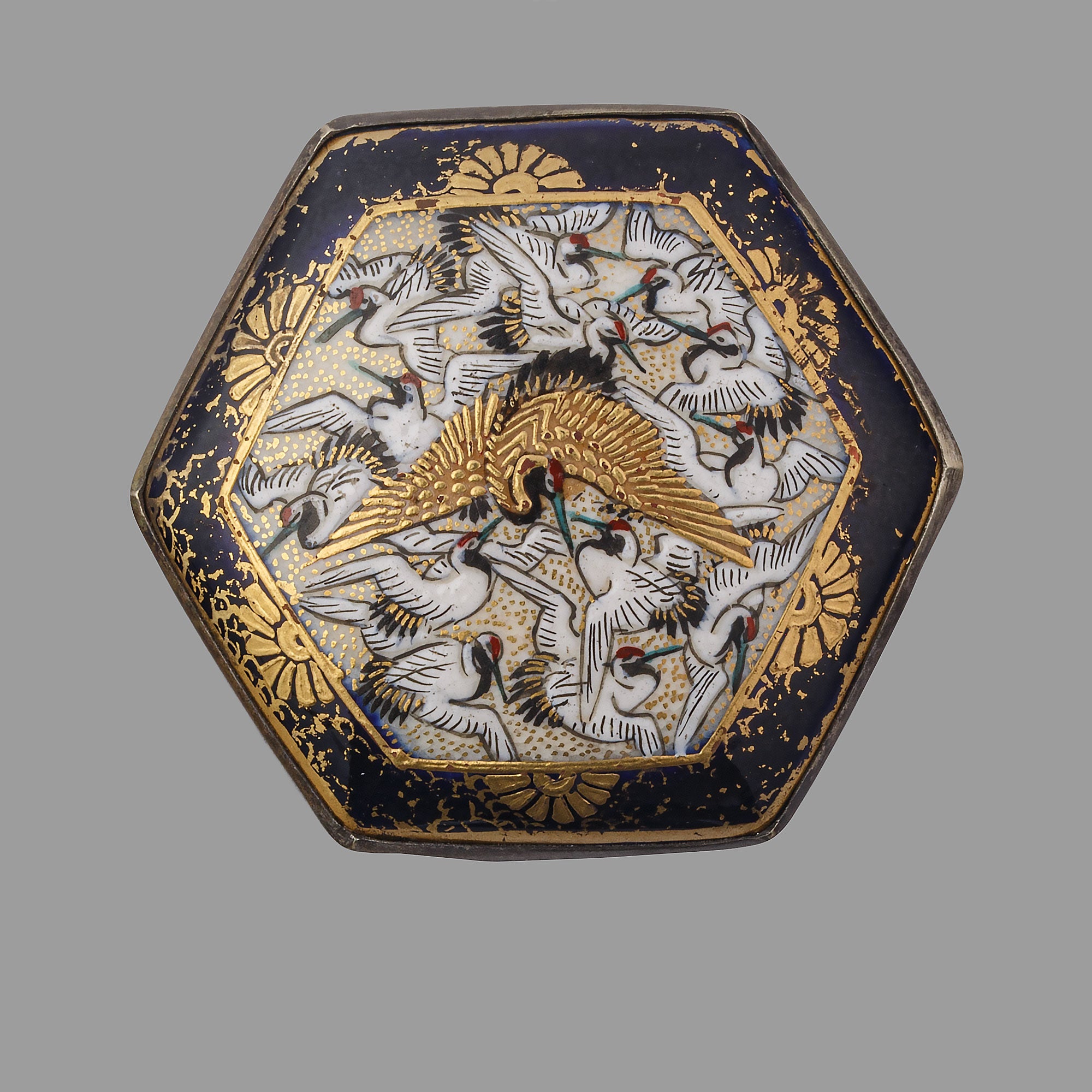 Antique Meiji period Satsuma ceramic hexagonal pendant in gold wash sterling silver setting with silver loop on the back.  It has the characteristic cream color and fine crackle in the glaze. The enamel work is really fine depicting a flock of white cranes.  a beautiful golder crane is featured in the front of the flock.   A dark blue border with gold enamel ornamentation completes the composition. 1 3/8 inches in diameter. Excellent condition.    The characteristic Satsuma chop is stamped on the back.  3/8 inches in thickness.  13.9 gram weight.