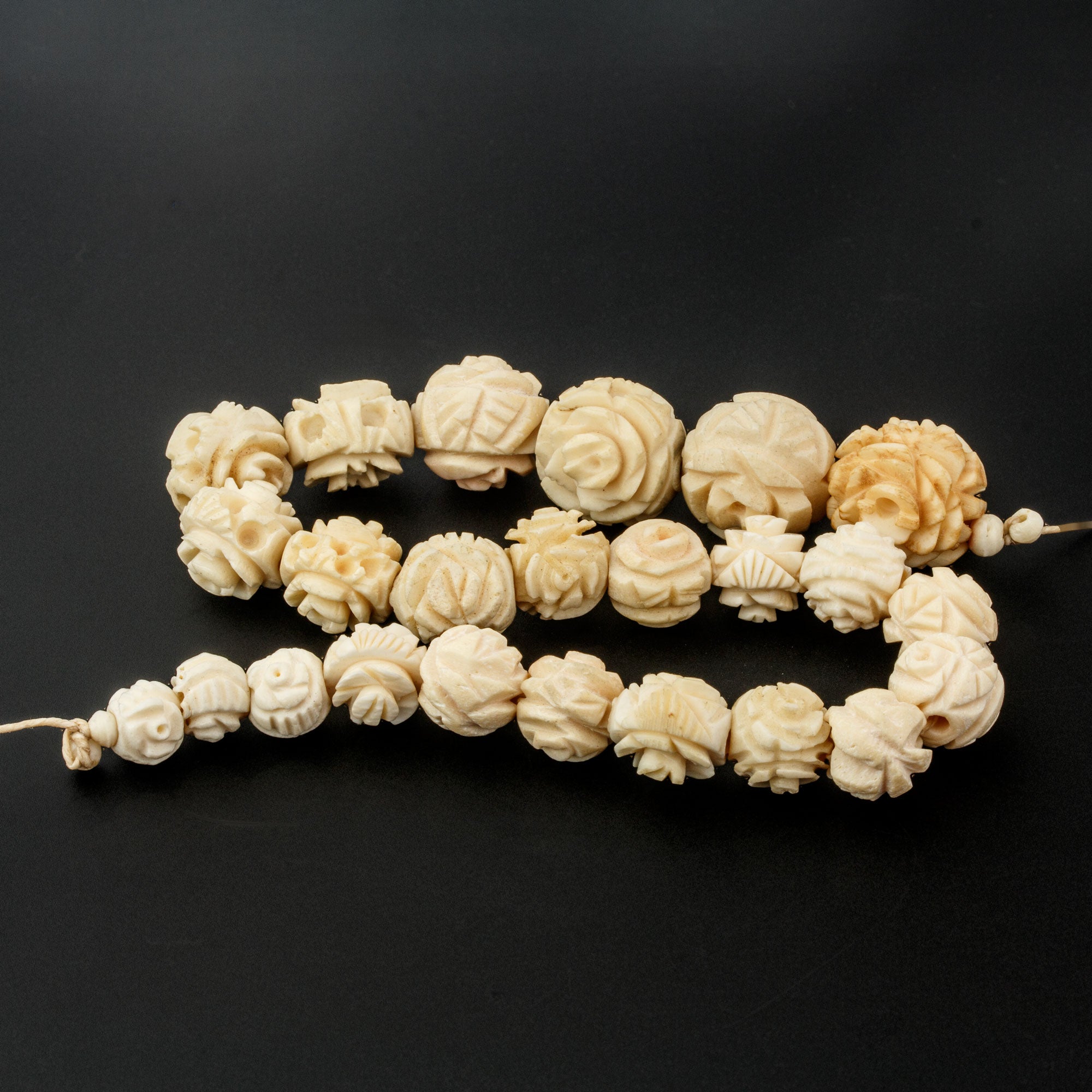 12 inch strand Art Deco Chinese export hand carved bovine bone rose beads, 8mm-14mm. 1920s-30s. b3-bo205