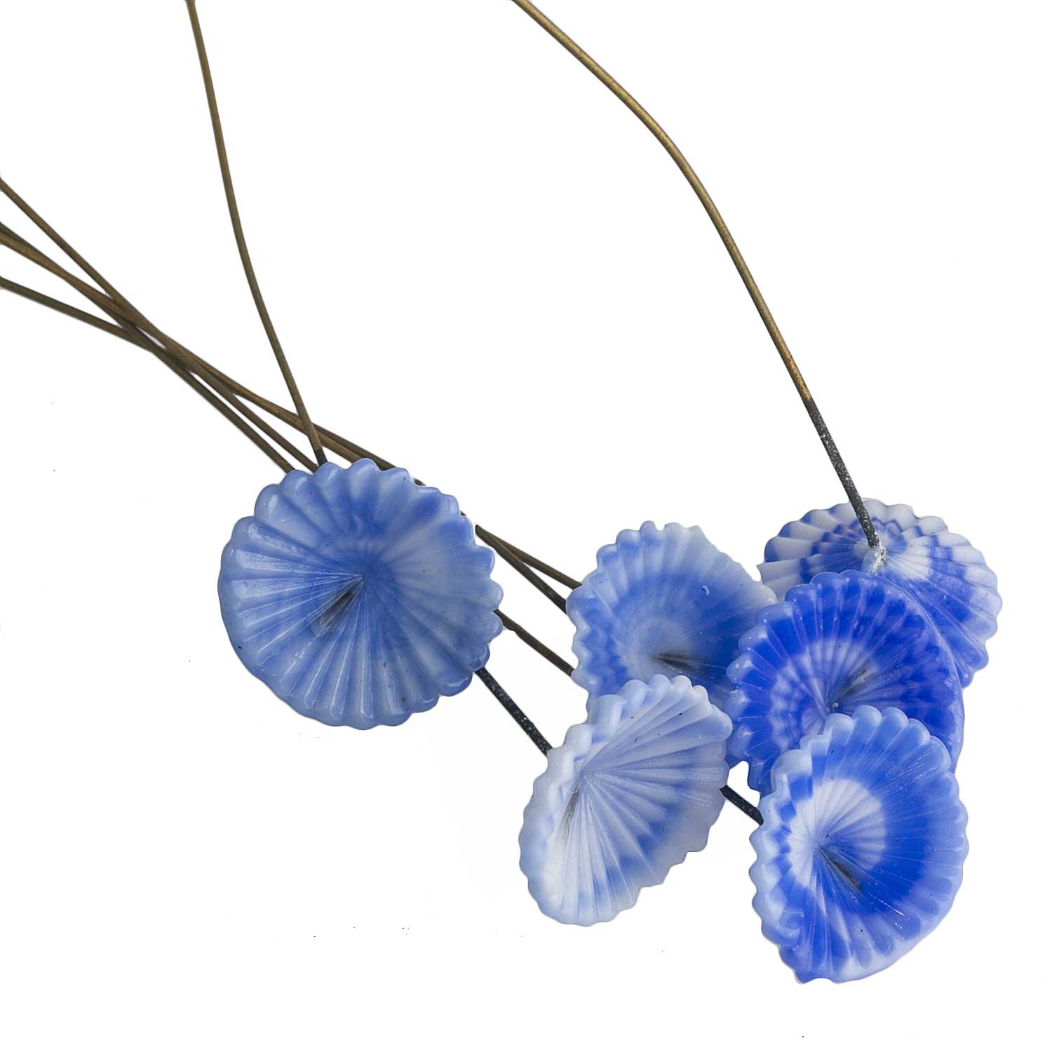 Wow. Pick a bouquet of these. Beautiful blue and white handmade glass flowers on soft wire. Use them as drops, in a glass bouquet brooch. Possibilities are endless. Cherry Brand, from occupied Japan, late 1940s through the 1950s. These are hand made so each one varies slightly. Average 15mm across. The brass wires are about 3"(76mm) in length. Bouquet of 6.