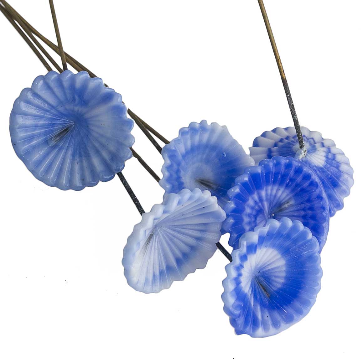 Blue & white glass flowers on wire. 76x15mm. Pkg 6. B11-BL-0636