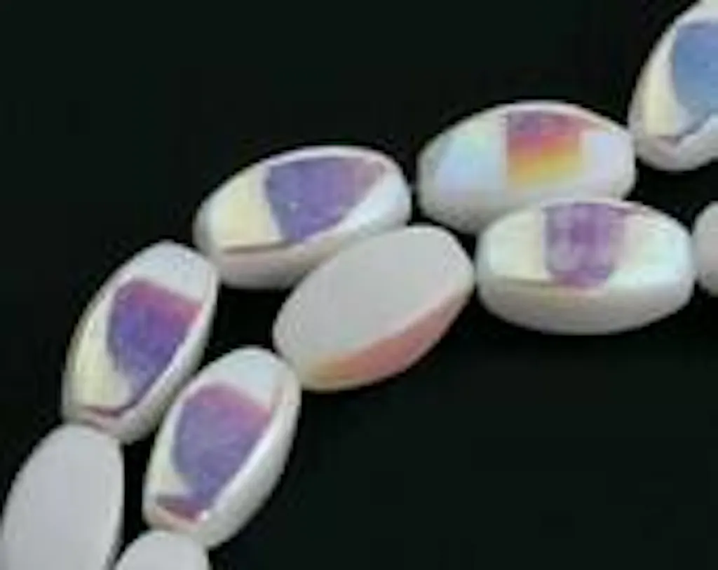 Chalk white 4 sided oval glass beads with AB finish on 1 side. West Germany. 11mm x 6 mm. Strand of 10 beads