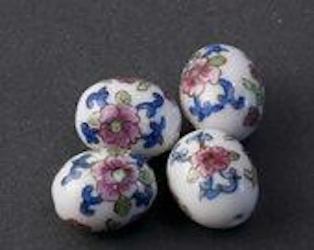 Chinese porcelain hand painted oval bead with blue pink an green floral design. 18x14mm. Package of 2