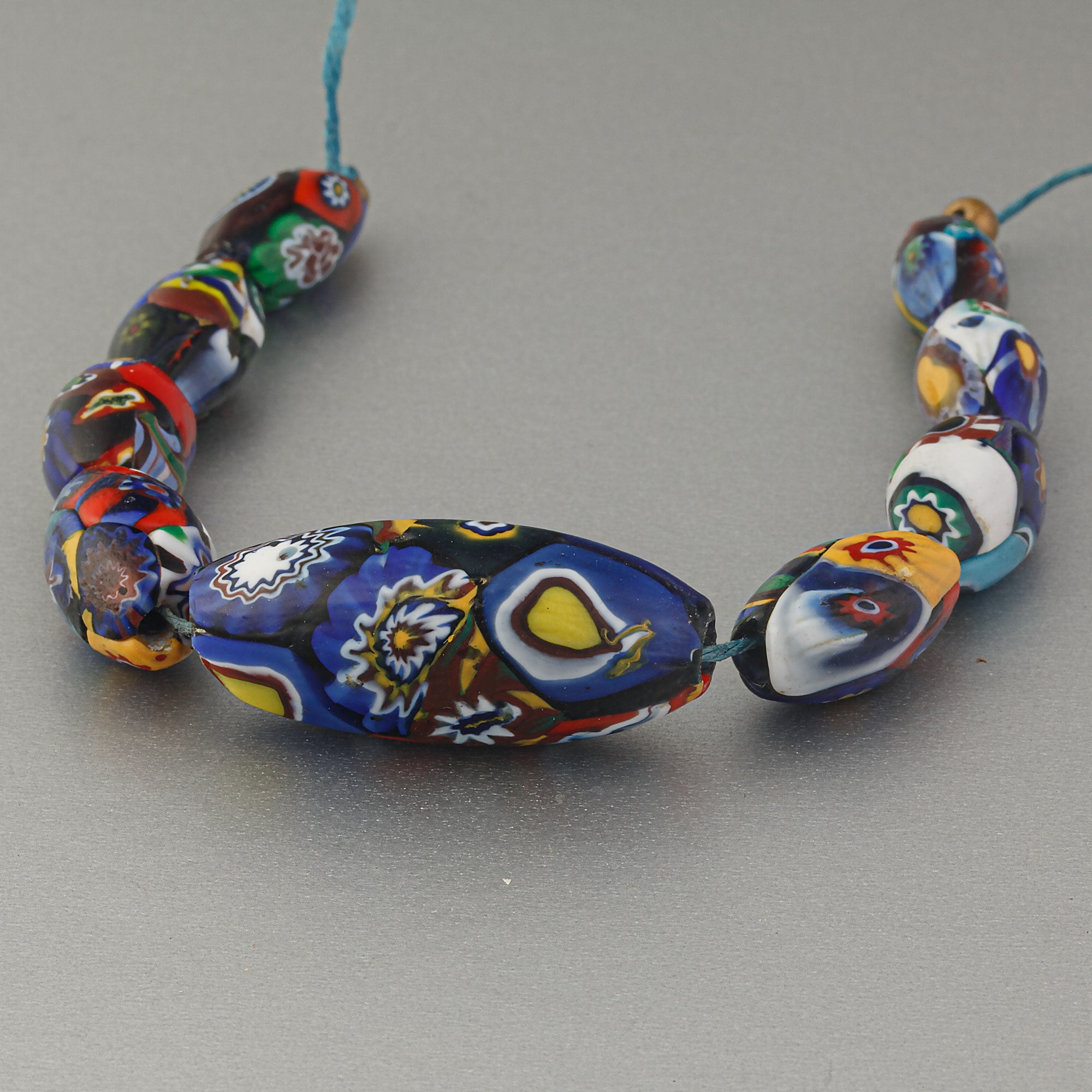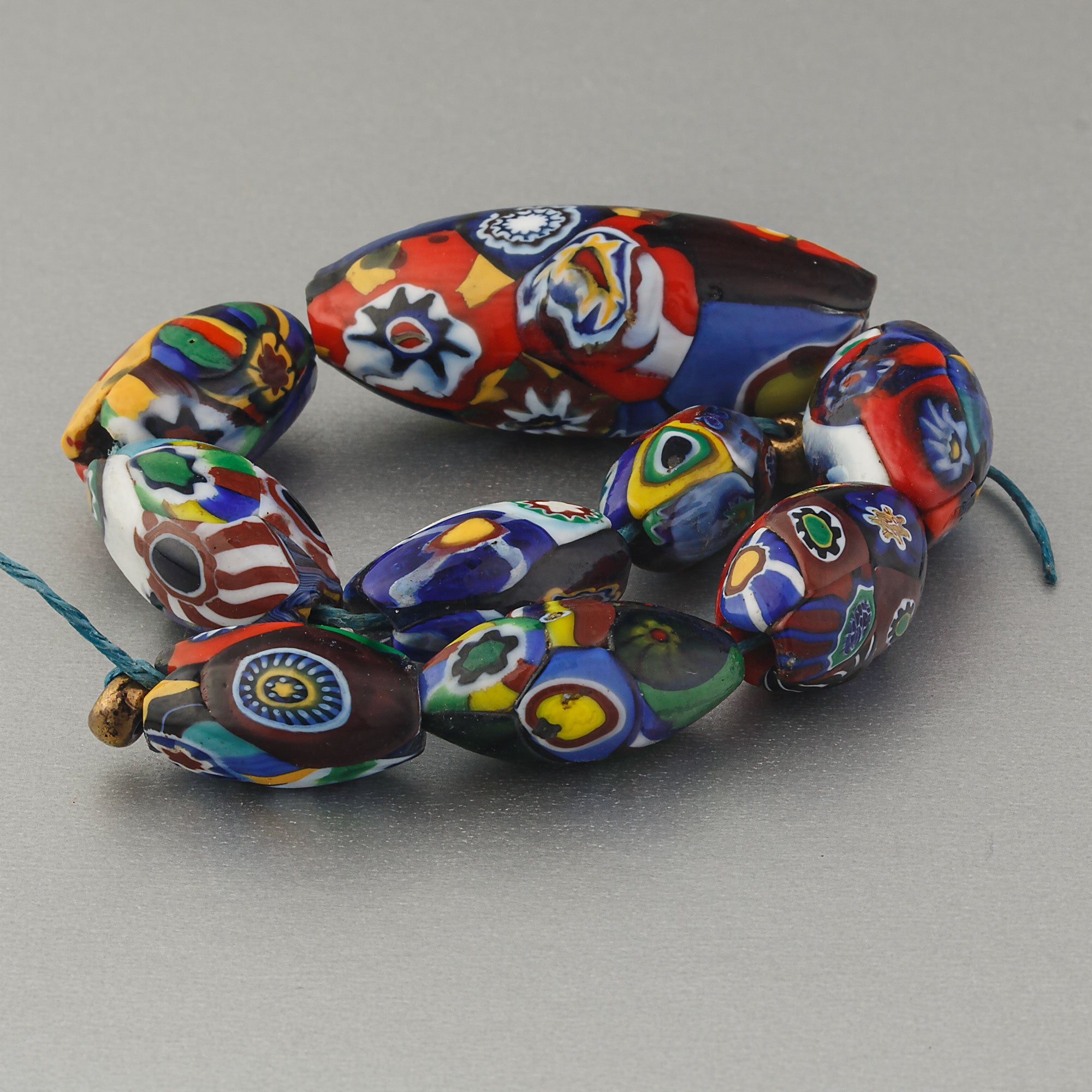 Graduated 6 inch strand of 9 vintage Murano millefiori glass oval beads dating from the 1940s-1950s. Lengths range from 16mm to 33mm,These beads have the fine detail and vintage colors found in the older Murano millefiori beads. Hole sizes range from 1mm to 3 mm. This strand will make a beautiful necklace with spacer beads.