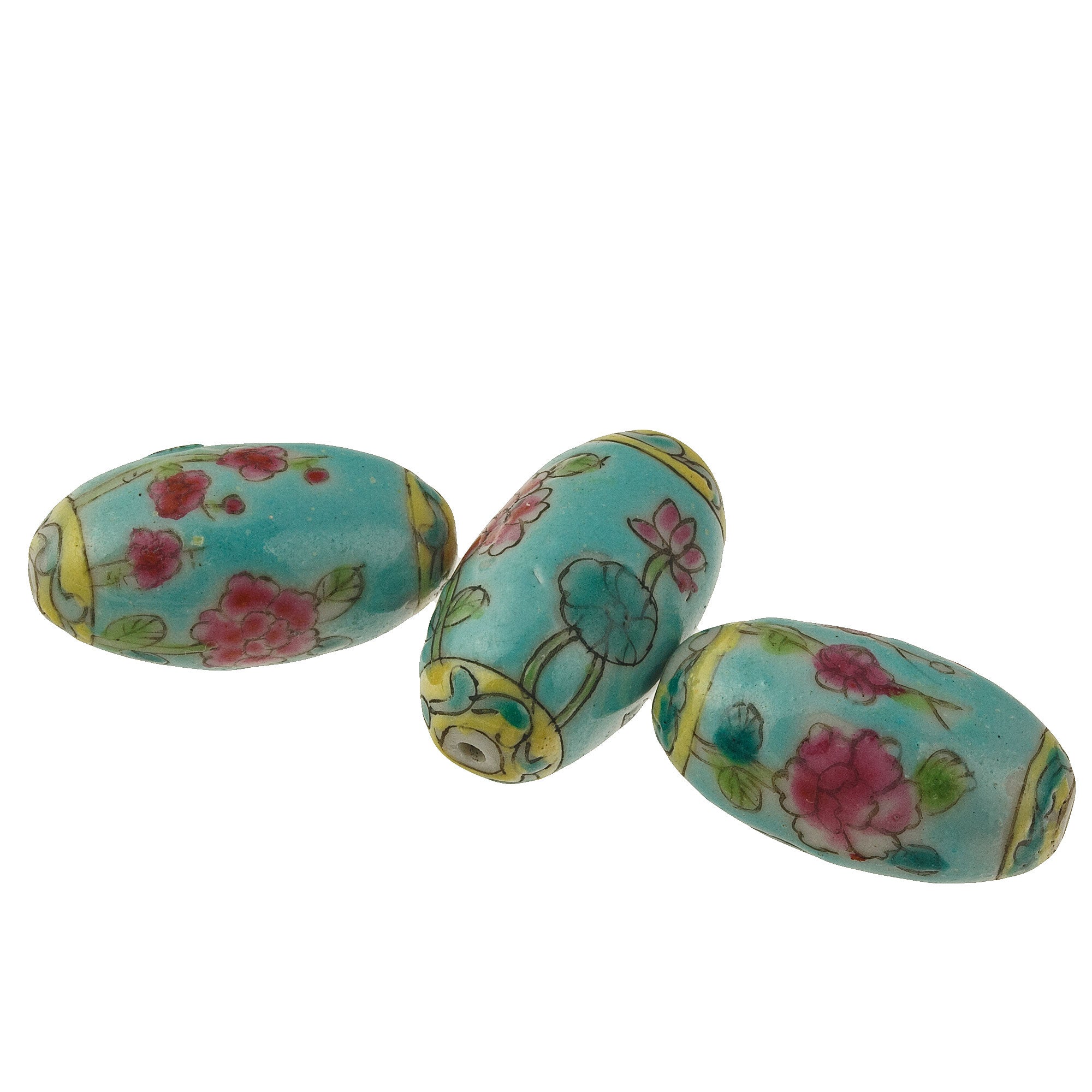Vintage Chinese hand-painted oval porcelain beads. These are gorgeous, pale blue with pink and green flowers and leaves. average size 25x14mm. Package of 2.